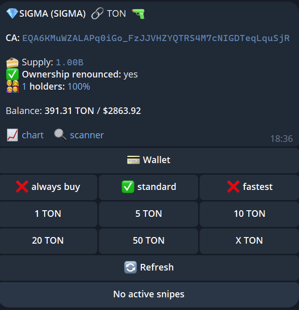 Setting up a snipe is similar to buying any token. Just select a button with amount of ton, or choose X TON to type desired amount.